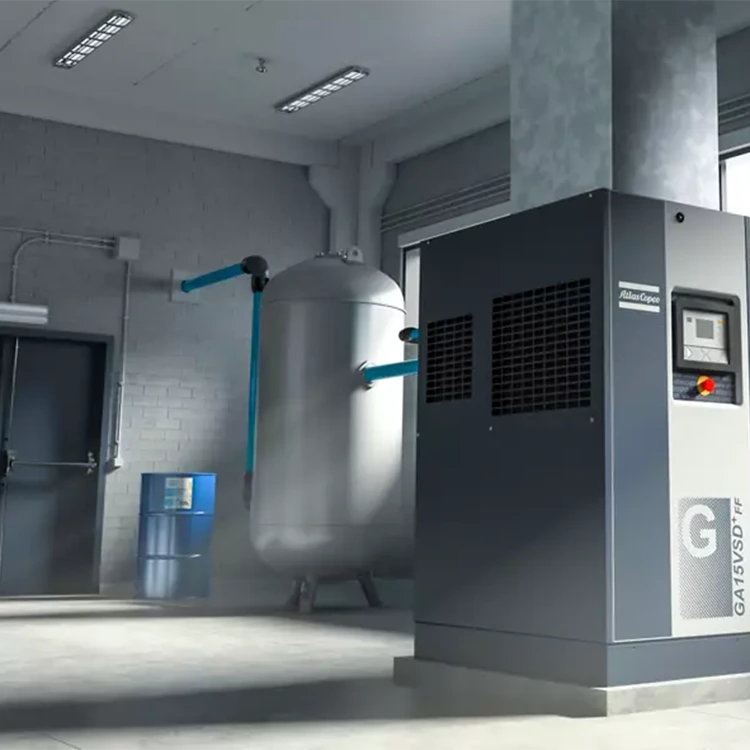 Ang ilang mga air compressor ay "naka-mount sa tangke", na nangangahulugang ang mga ito ay ibinigay bilang isang kumpletong yunit at naka-install sa ibabaw ng tangke ng pagtanggap ng hangin. Ang paggamit ng mga tank-type air compressor ay hindi lamang nakakatipid ng espasyo ngunit binabawasan din ang paunang gastos sa pag-install na kinakailangan para sa pag-install ng mga indibidwal na dryer. Ang pagsasaayos na ito ay napaka-pangkaraniwan sa maliliit na air compressor, at ang output power ay karaniwang hindi lalampas sa 26 kilowatts (o 35 horsepower). Ang malalaking air compressor ay hindi angkop para sa mga disenyo ng pag-install ng tangke dahil ito ay magreresulta sa isang top-heavy setup, na posibleng magdulot ng mga panganib sa kaligtasan.