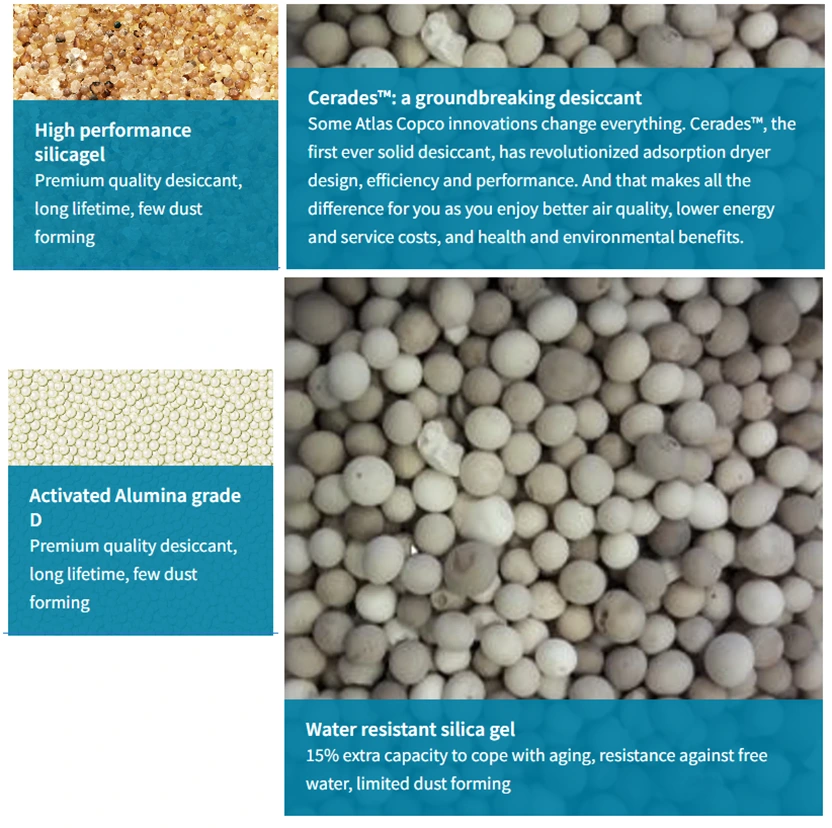 Depende sa pressure dew point, ang mga desiccant ay maaaring gawin ng alumina, silica gel o molecular sieve materials. Ang pinakamababang pressure dew point ay maaaring umabot sa -70 ℃.