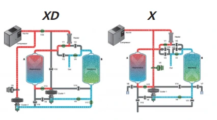 Higit pa rito, ang XD o X compression heat dryer ay tunay na zero-air-consumption dryer, na hindi kumonsumo ng enerhiya o isang bahagi lamang ng naka-compress na hangin sa panahon ng cold-blowing phase.
