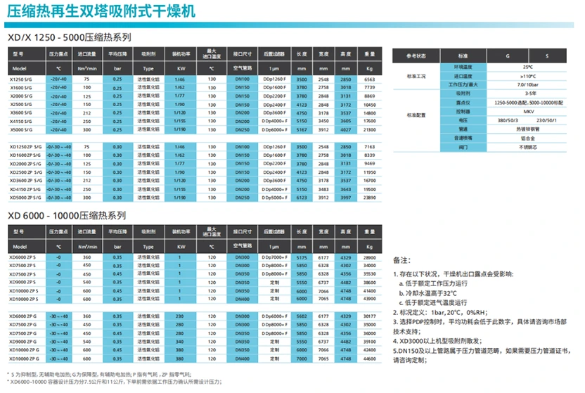 Gumagamit ang XD o X compression heat adsorption dryer ng mga de-kalidad na adsorbents at mahusay na ginagamit ang init ng compression mula sa oil-free compressor upang muling buuin ang adsorbent, na makabuluhang binabawasan ang pagkonsumo ng enerhiya at mga gastos sa pagpapanatili.