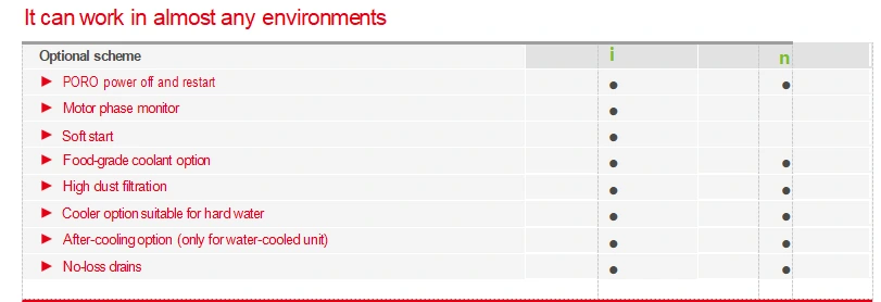 Ang aming mga compressor ay nag-aalok ng mga food-grade coolant, mataas na dust filtration at hard water cooler at iba pang mga opsyon na inangkop sa malupit na kapaligiran, na maaaring matugunan ang iyong maraming pangangailangan sa aplikasyon.