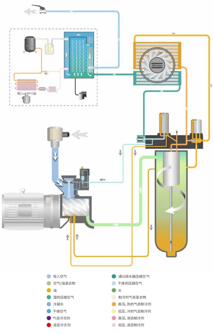 · Ang built-in na dryer ay gumagamit ng countercurrent heat exchanger, built-in na water separator, at maaaring ayusin ang dryer ayon sa load ng air compressor.