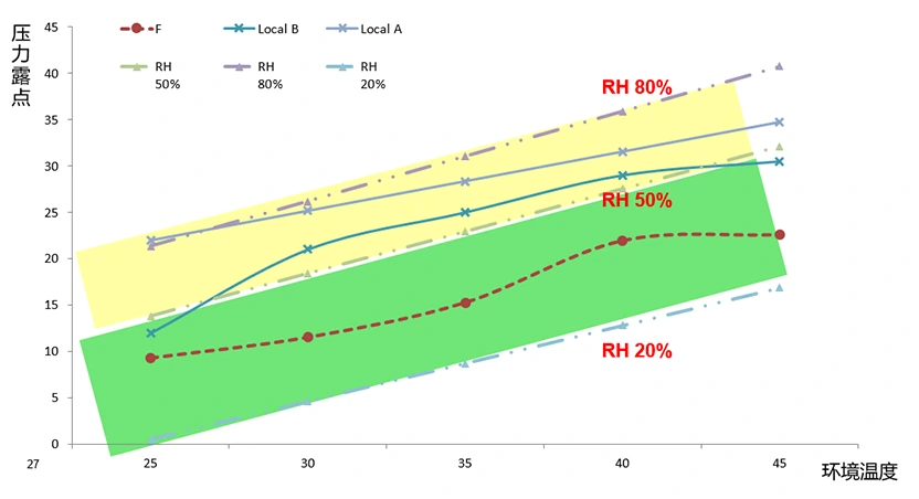 Gaya ng ipinapakita sa sinusukat na data sa ibaba, na may compressed air inlet pressure na 7 Bar, isang inlet na temperatura na 35°C, isang pressure dew point na 7°C, at isang huling exhaust temperature na 25°C, ang relatibong halumigmig ng hangin ay 30%, na epektibong pumipigil sa kaagnasan ng mga pipeline at kagamitan na gumagamit ng hangin.