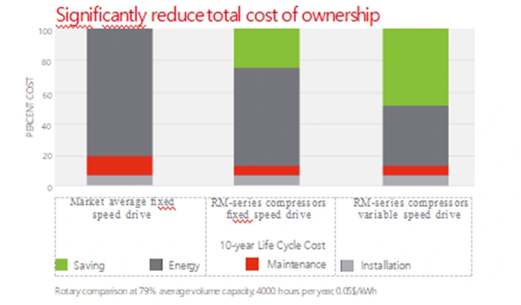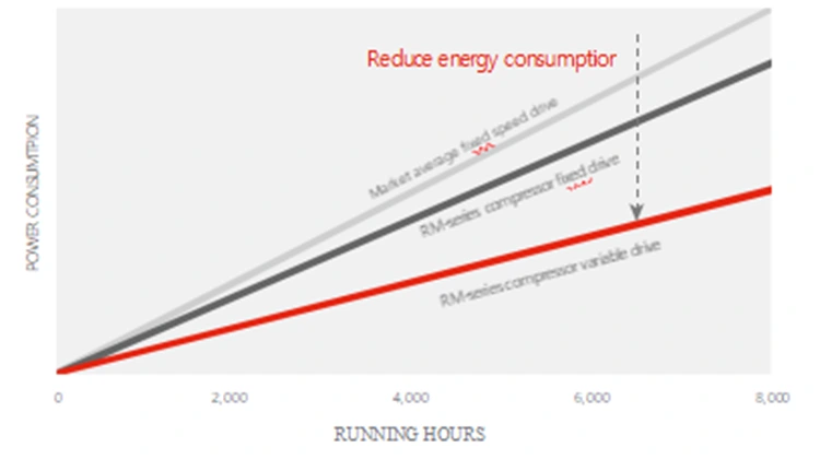 Ang RM Screw Air Compressors ay lahat ay gumagamit ng isang bagung-bagong high-efficiency na pangunahing unit, na pinagsasama ang fixed-frequency na IE3 at ECO*-PM na permanenteng magnet inverter na IE5 na mga teknolohiyang motor na matipid sa enerhiya, na makakatipid sa iyo ng hanggang 12-30% sa mga gastos sa kuryente.