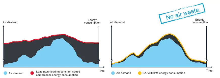 Ang serye ng VSDiPM ng Atlas Copco ay maaaring awtomatikong ayusin ang bilis ng motor upang tumpak na makontrol at matugunan ang mga kinakailangan sa paggamit ng gas ng mga customer. Kung ikukumpara sa mga compressor na hinihimok ng tinukoy na bilis, ang VSD Variable Frequency Air Compressor ay nakakatipid ng average na hanggang 35% ng enerhiya.