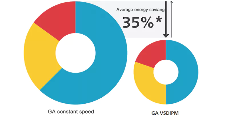 Ang napakahusay na mga compressor ng serye ng VSDiPM ay nakakatipid ng average ng hanggang 35%* ng enerhiya kumpara sa mga compressor na pinapatakbo sa mga tinukoy na bilis